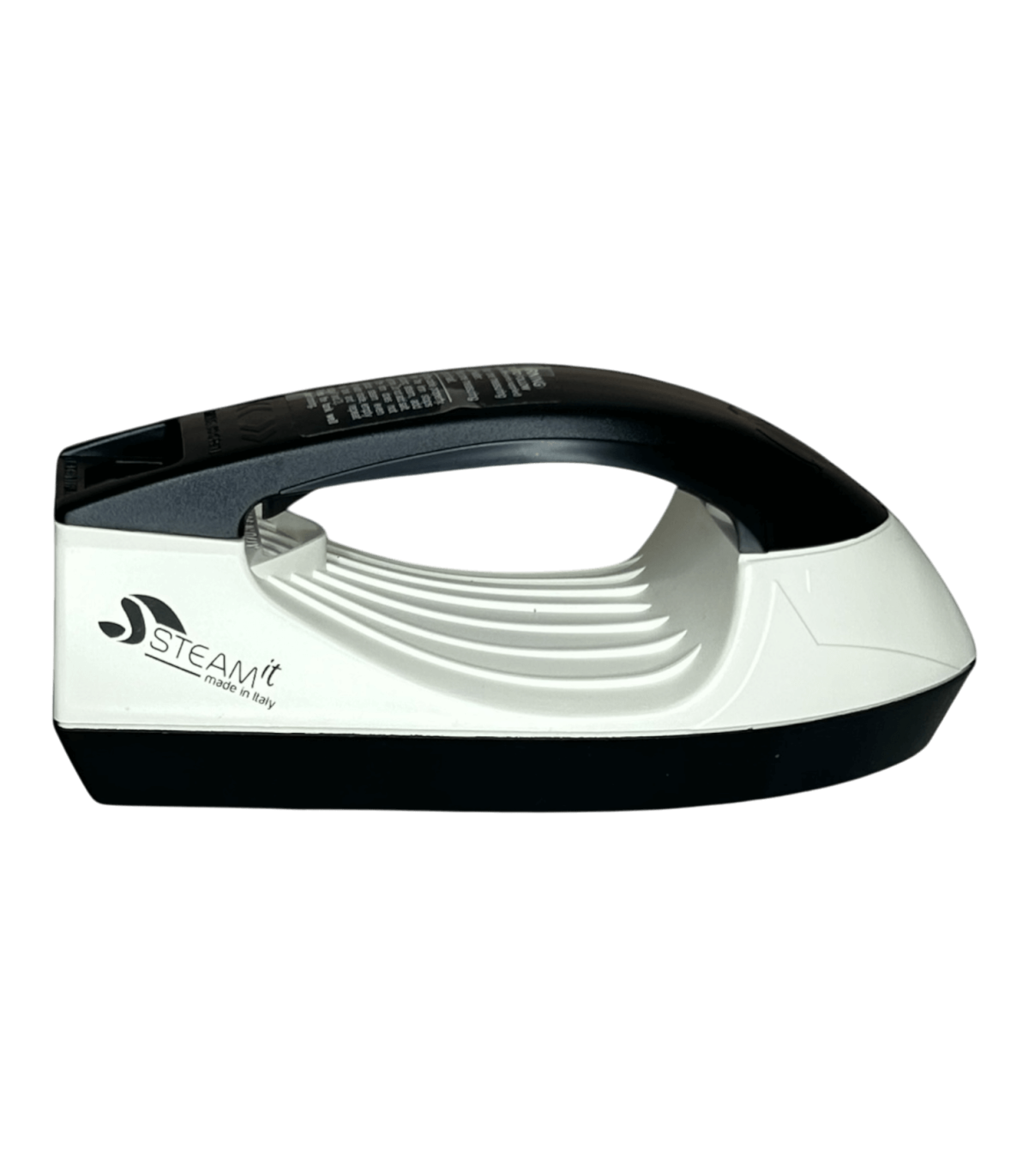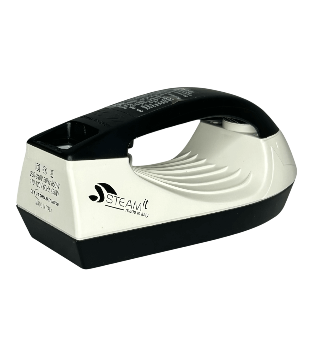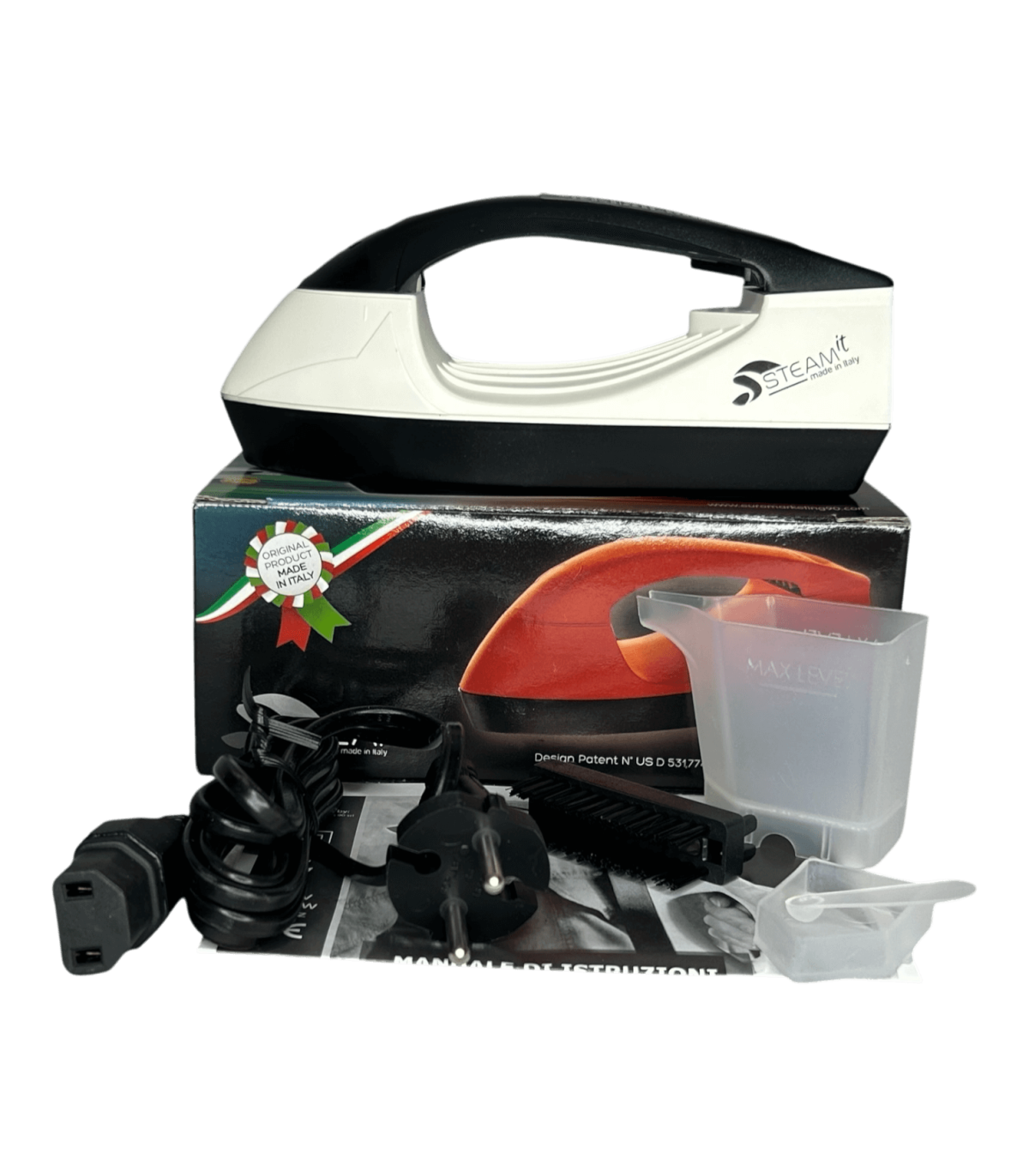 Mini fer à repasser et défroisseur Steam-it Blanc-Noir, compact et léger (env. 500 g), utilisable sans réglage, compatible 110V et 220V, fourni avec gobelet doseur, récipient à sel intégré, cuillère doseuse ( 1 doses tous les 2 remplissages si noire, 2 à 3 doses si transparente), brosse en nylon, câble avec prise 220V française, notice incluse.