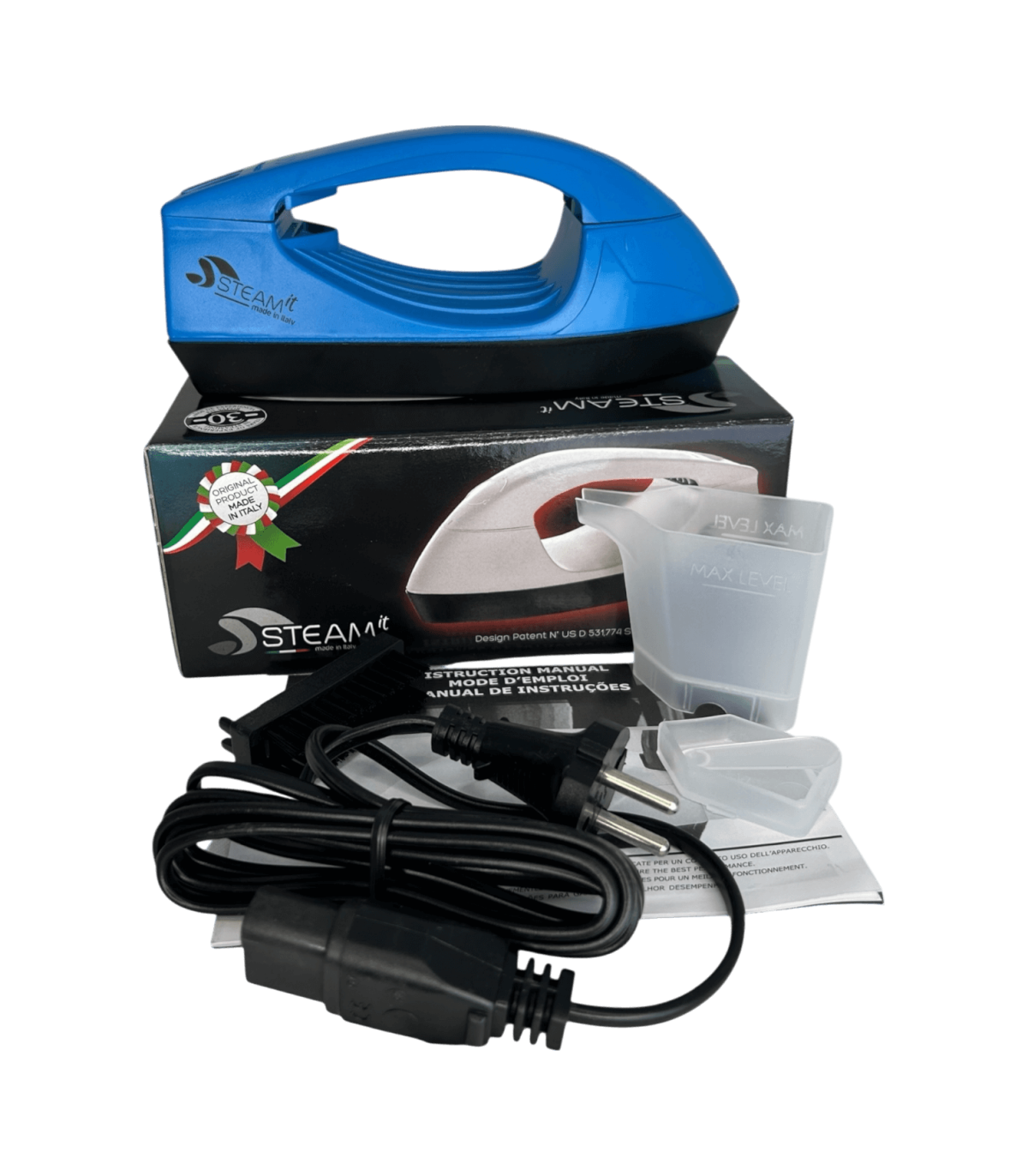 Mini fer à repasser et défroisseur Steam-it bleu, compact et léger (env. 500 g), utilisable sans réglage, compatible 110V et 220V, fourni avec gobelet doseur, récipient à sel intégré, cuillère doseuse ( 1 doses tous les 2 remplissages si noire, 2 à 3 doses si transparente), brosse en nylon, câble avec prise 220V française, notice incluse.