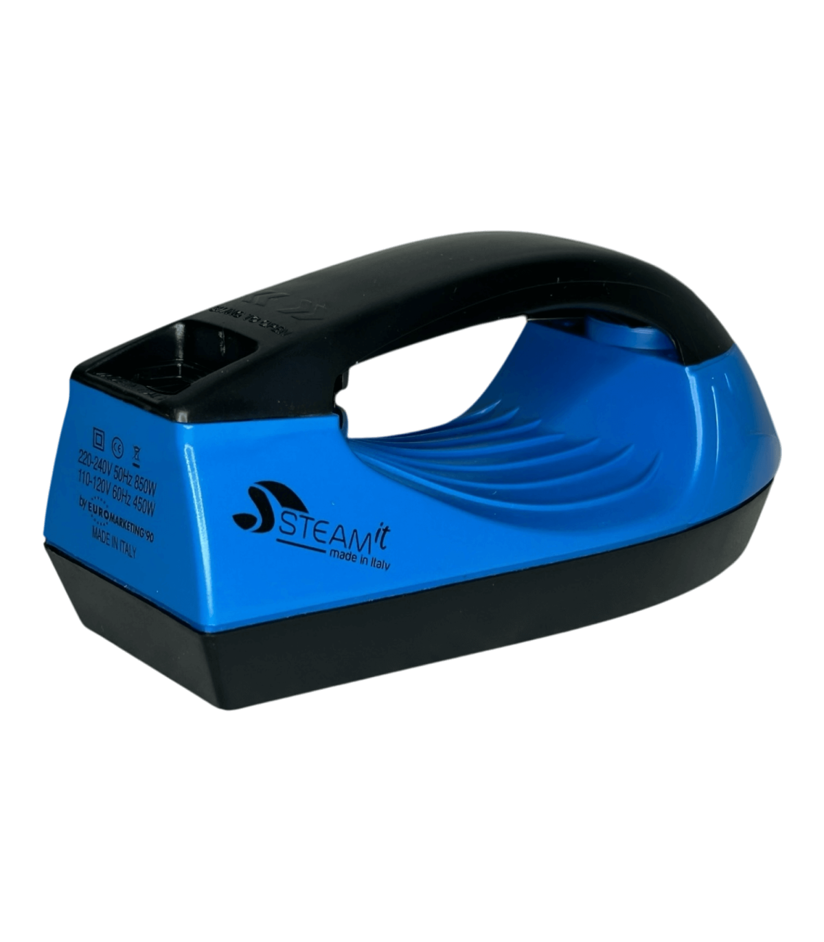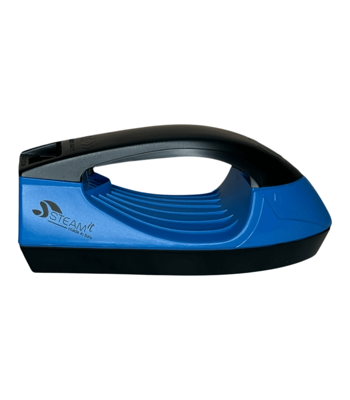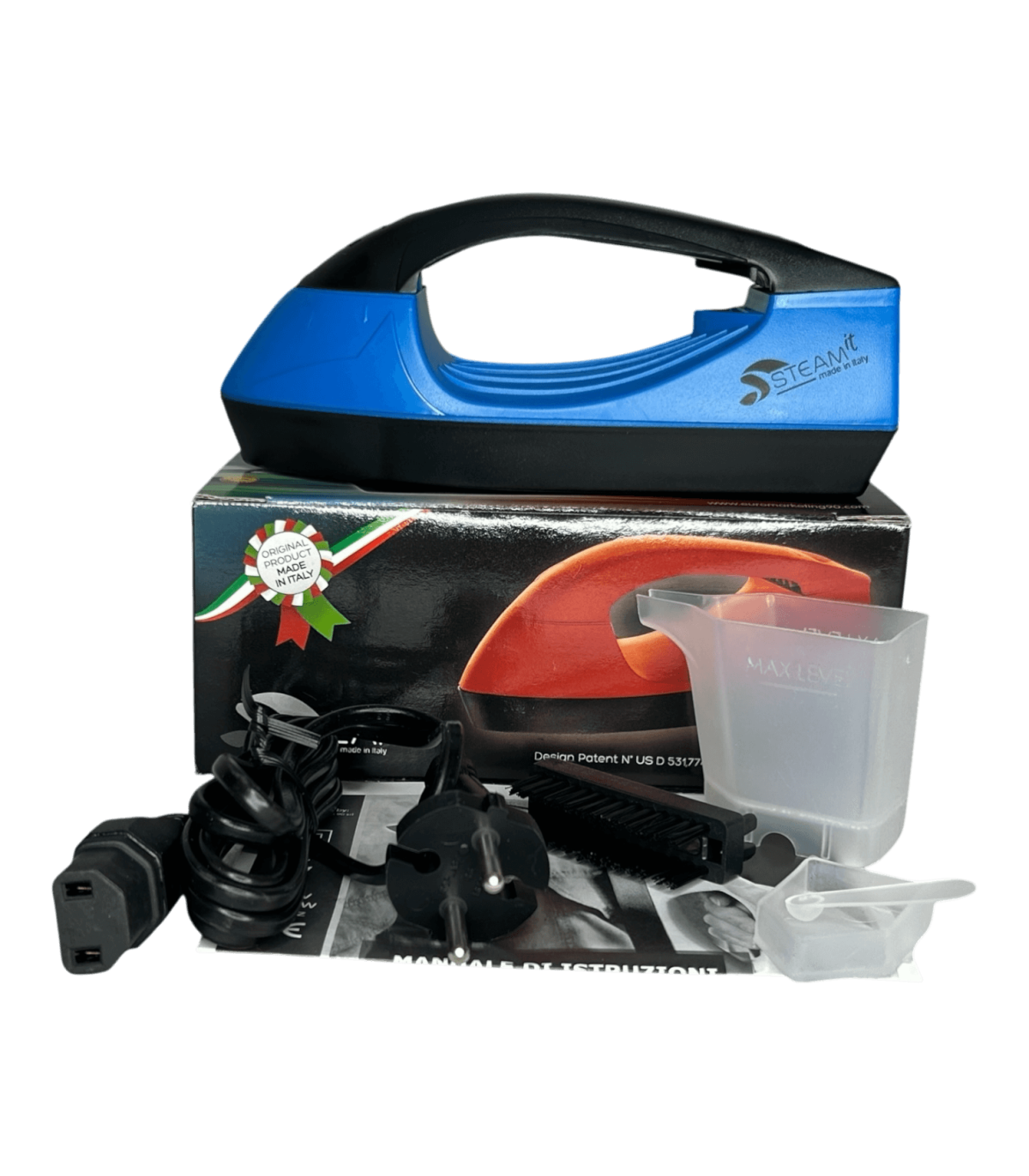 Mini fer à repasser et défroisseur Steam-it Bleu-Noir, compact et léger (env. 500 g), utilisable sans réglage, compatible 110V et 220V, fourni avec gobelet doseur, récipient à sel intégré, cuillère doseuse ( 1 doses tous les 2 remplissages si noire, 2 à 3 doses si transparente), brosse en nylon, câble avec prise 220V française, notice incluse.