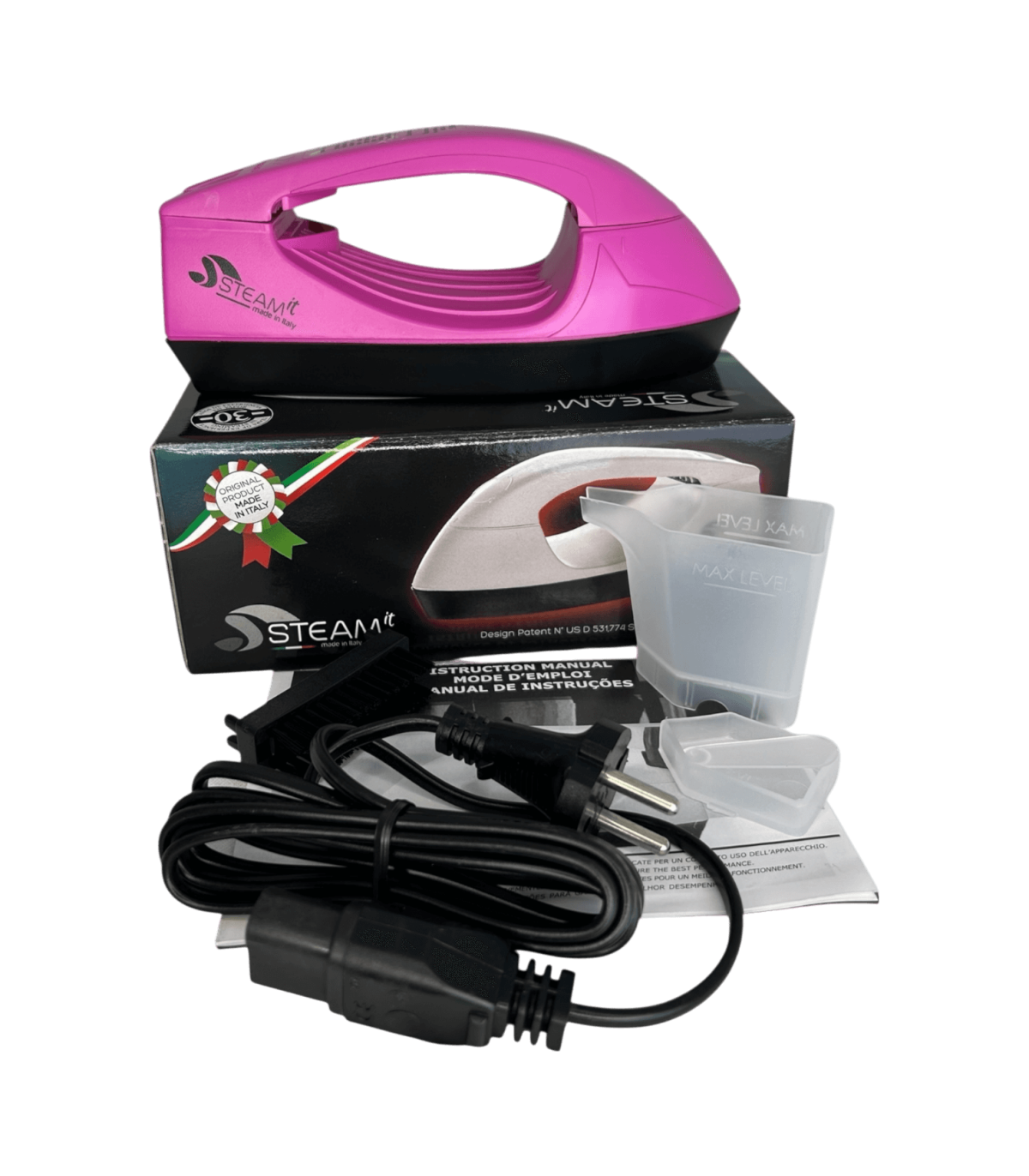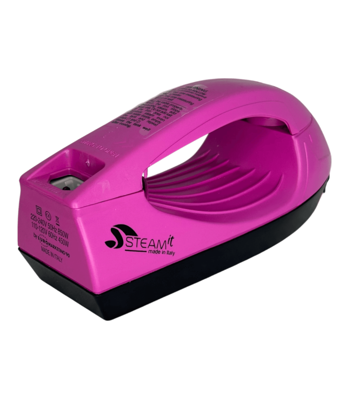 Mini fer à repasser et défroisseur Steam-it fuchsia, compact et léger (env. 500 g), utilisable sans réglage, compatible 110V et 220V, fourni avec gobelet doseur, récipient à sel intégré, cuillère doseuse ( 1 doses tous les 2 remplissages si noire, 2 à 3 doses si transparente), brosse en nylon, câble avec prise 220V française, notice incluse.