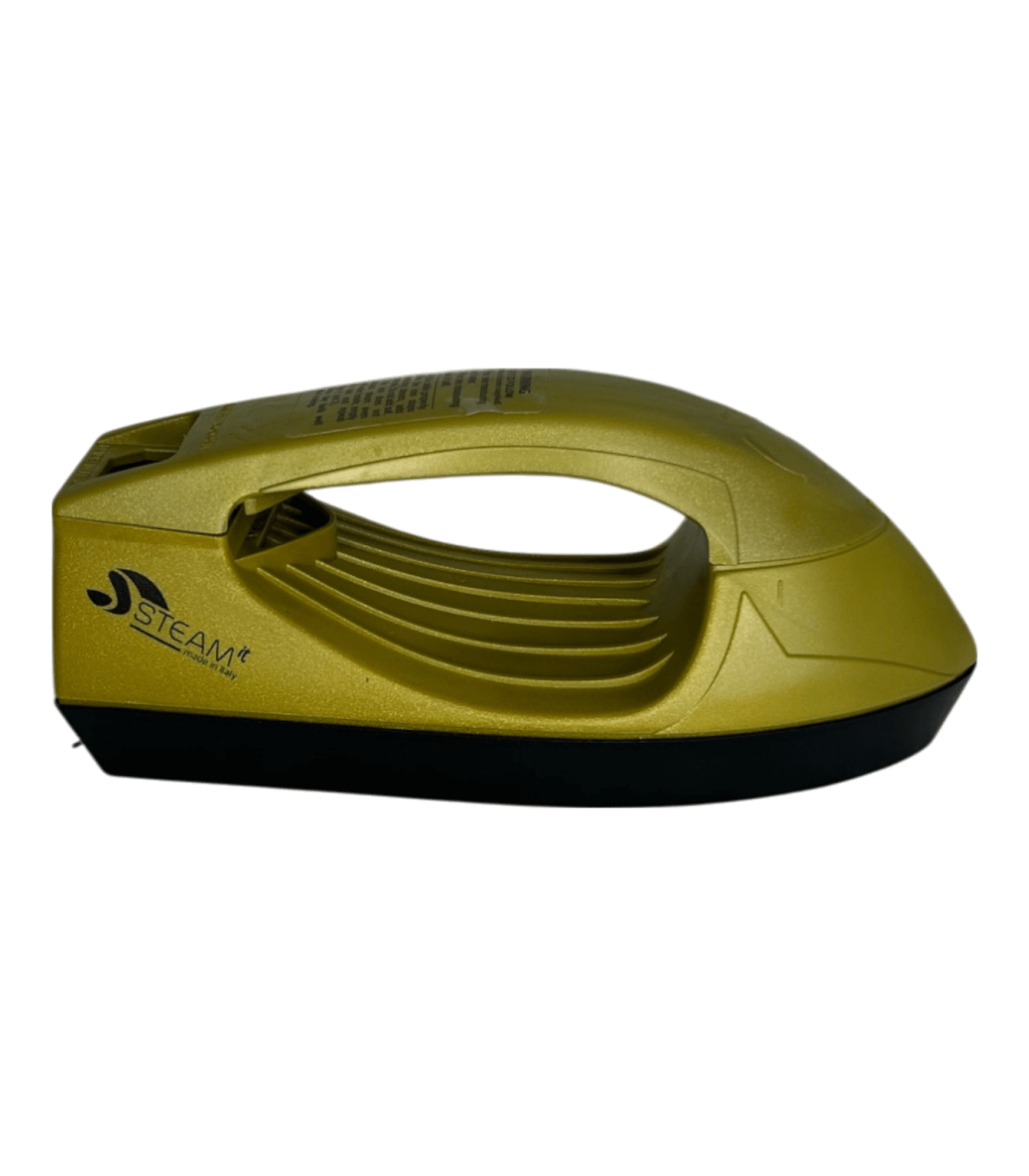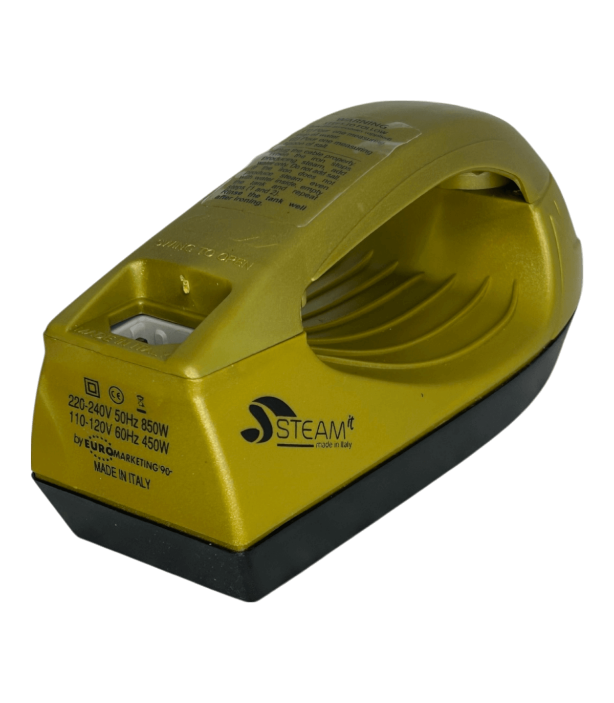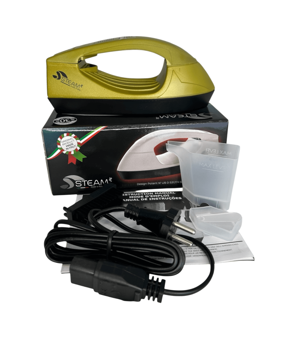 Mini fer à repasser et défroisseur Steam-it gold, compact et léger (env. 500 g), utilisable sans réglage, compatible 110V et 220V, fourni avec gobelet doseur, récipient à sel intégré, cuillère doseuse ( 1 doses tous les 2 remplissages si noire, 2 à 3 doses si transparente), brosse en nylon, câble avec prise 220V française, notice incluse.