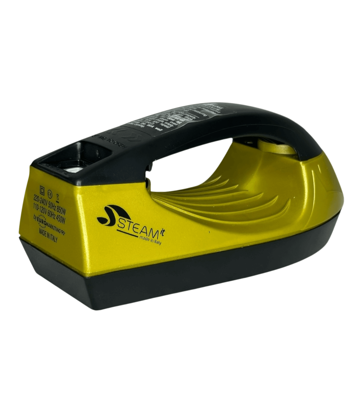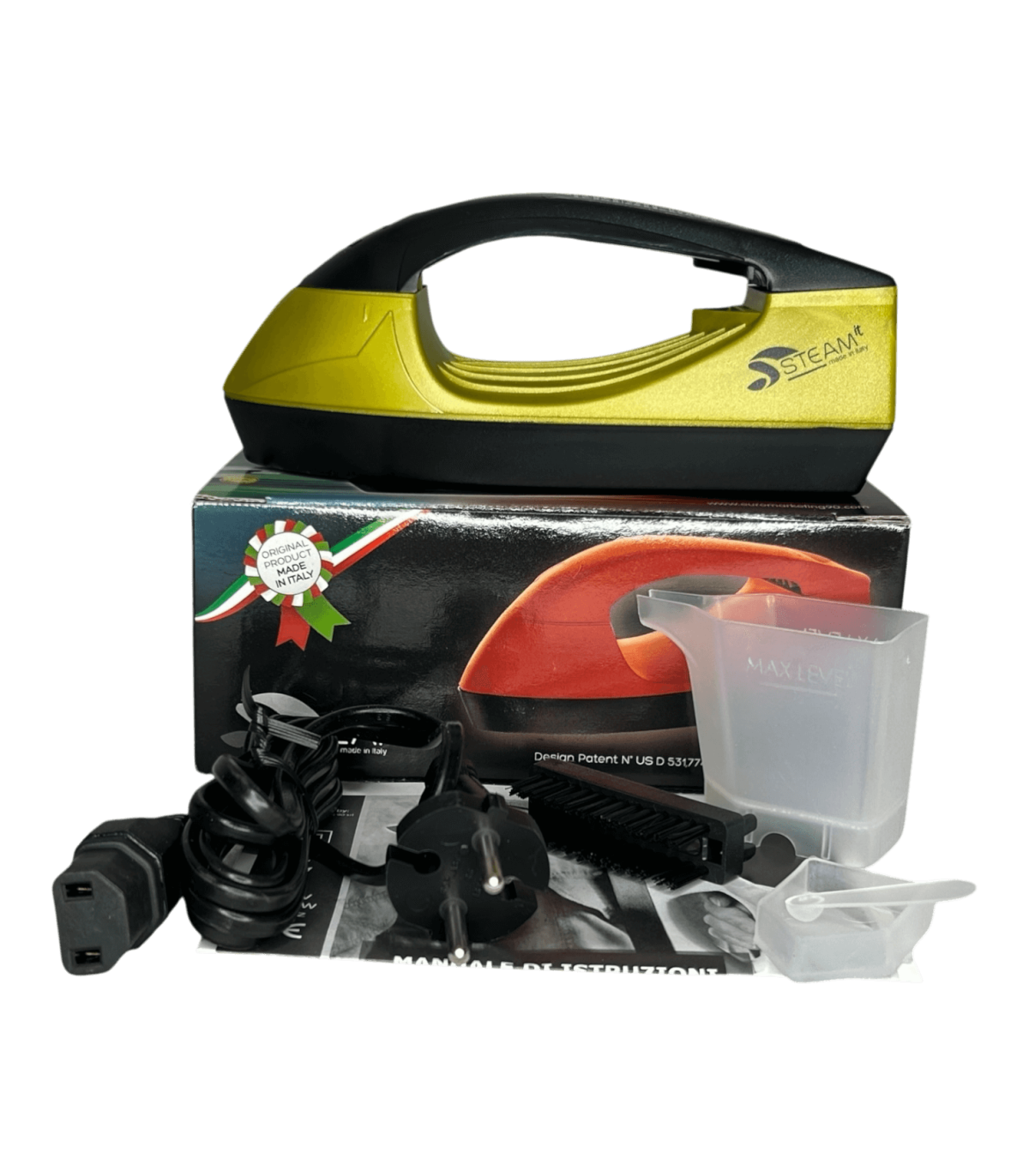 Mini fer à repasser et défroisseur Steam-it Gold-Noir, compact et léger (env. 500 g), utilisable sans réglage, compatible 110V et 220V, fourni avec gobelet doseur, récipient à sel intégré, cuillère doseuse ( 1 doses tous les 2 remplissages si noire, 2 à 3 doses si transparente), brosse en nylon, câble avec prise 220V française, notice incluse.