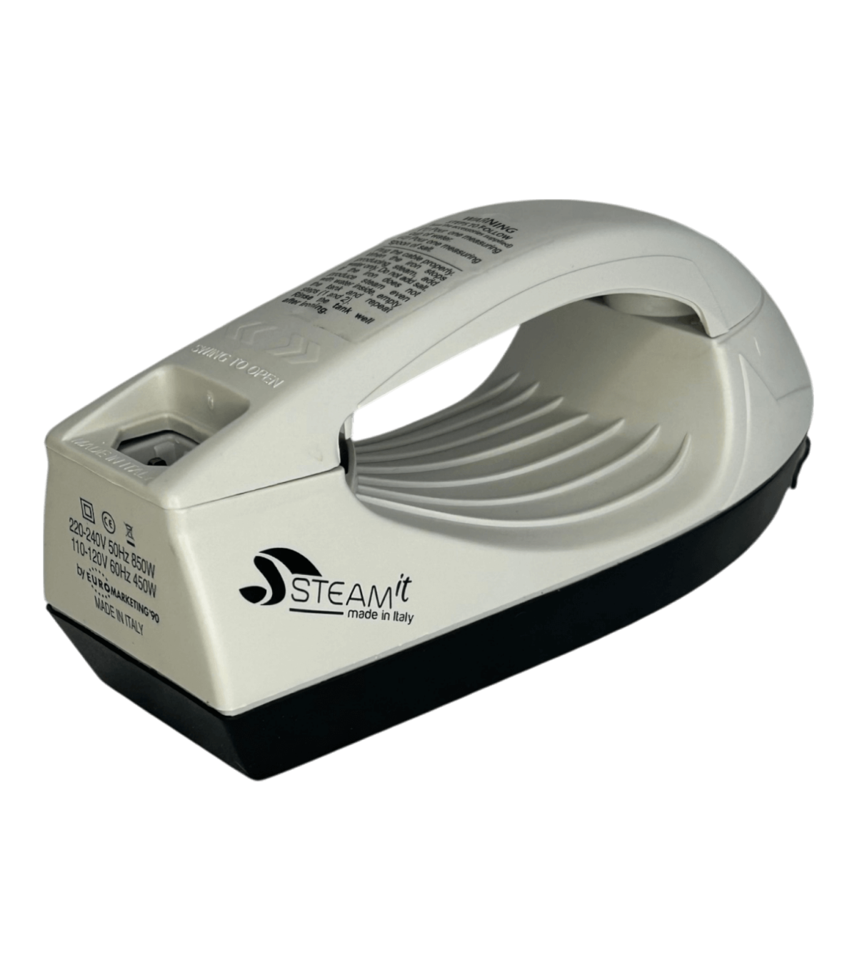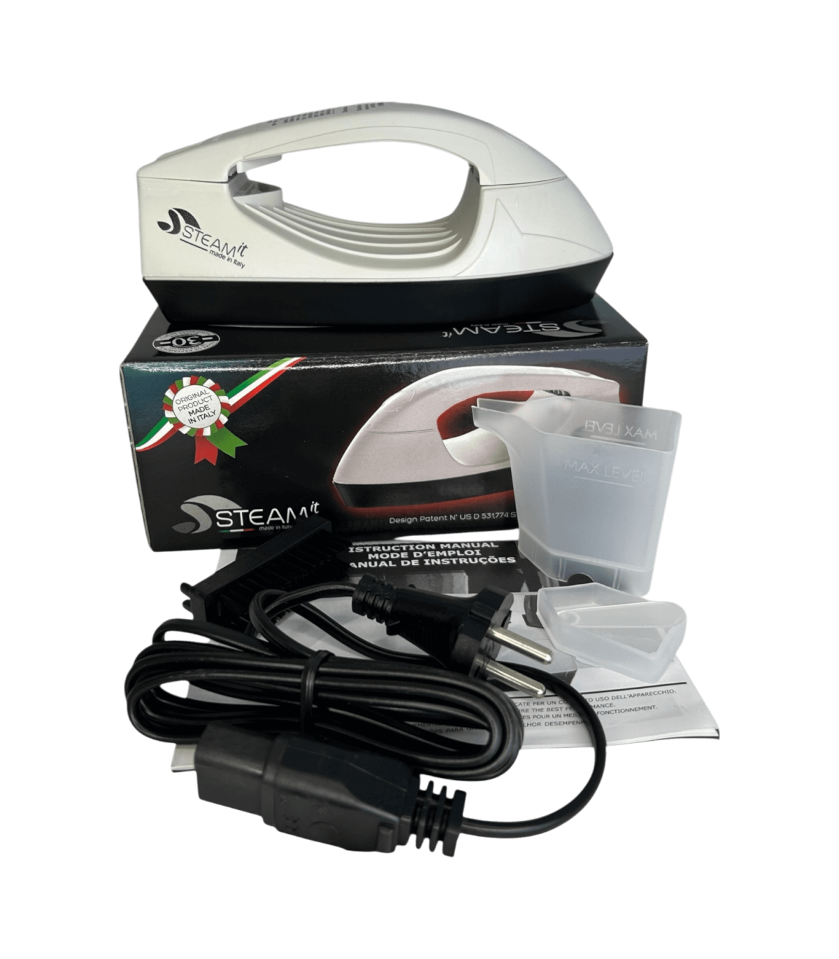 Mini fer à repasser et défroisseur Steam-it grey, compact et léger (env. 500 g), utilisable sans réglage, compatible 110V et 220V, fourni avec gobelet doseur, récipient à sel intégré, cuillère doseuse ( 1 doses tous les 2 remplissages si noire, 2 à 3 doses si transparente), brosse en nylon, câble avec prise 220V française, notice incluse.