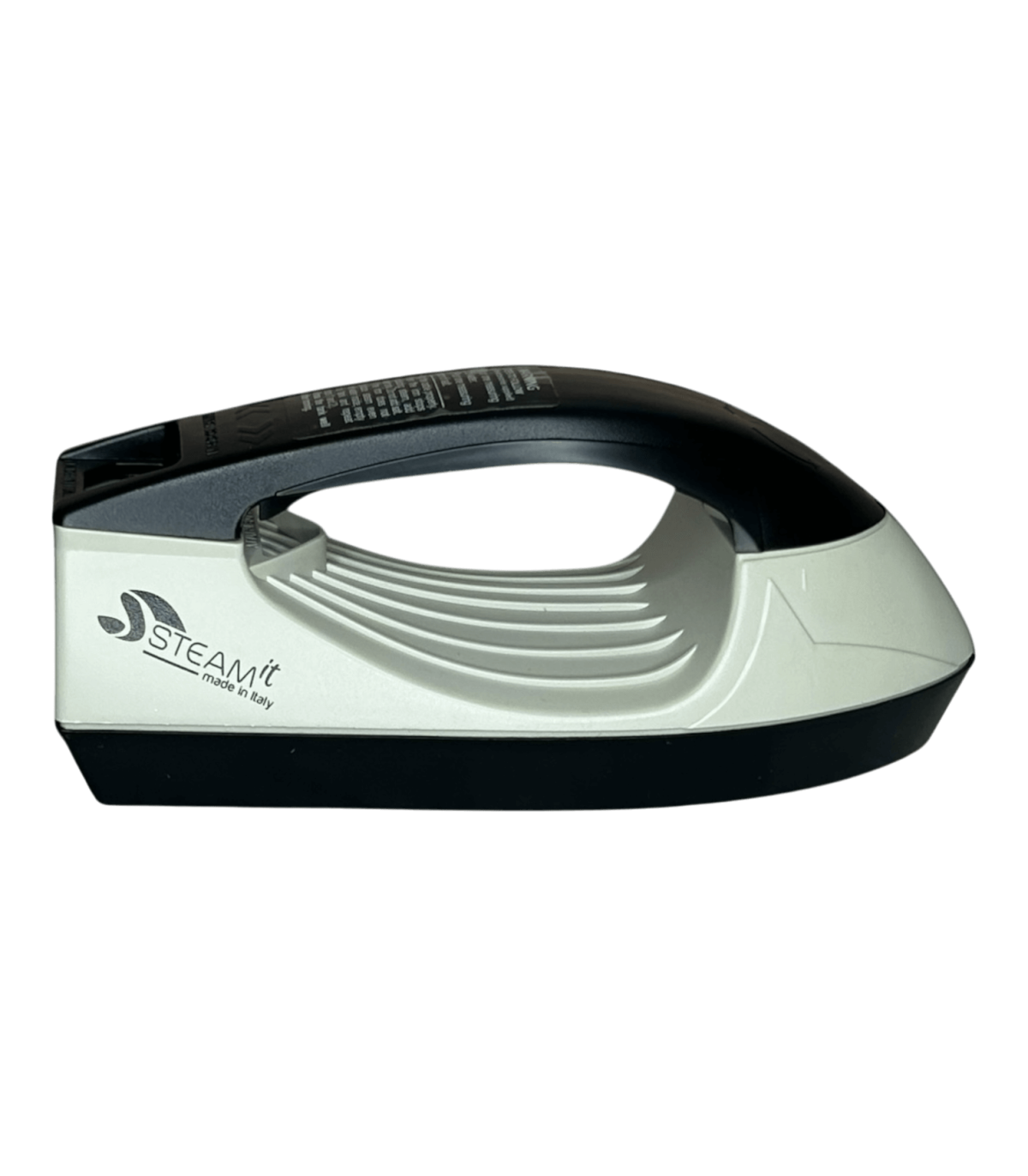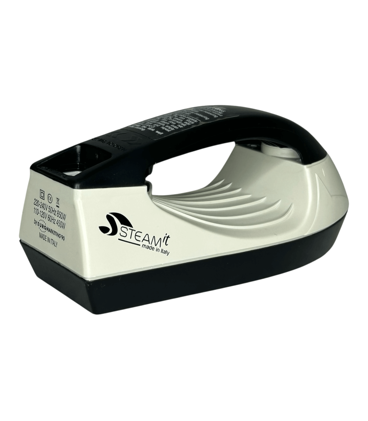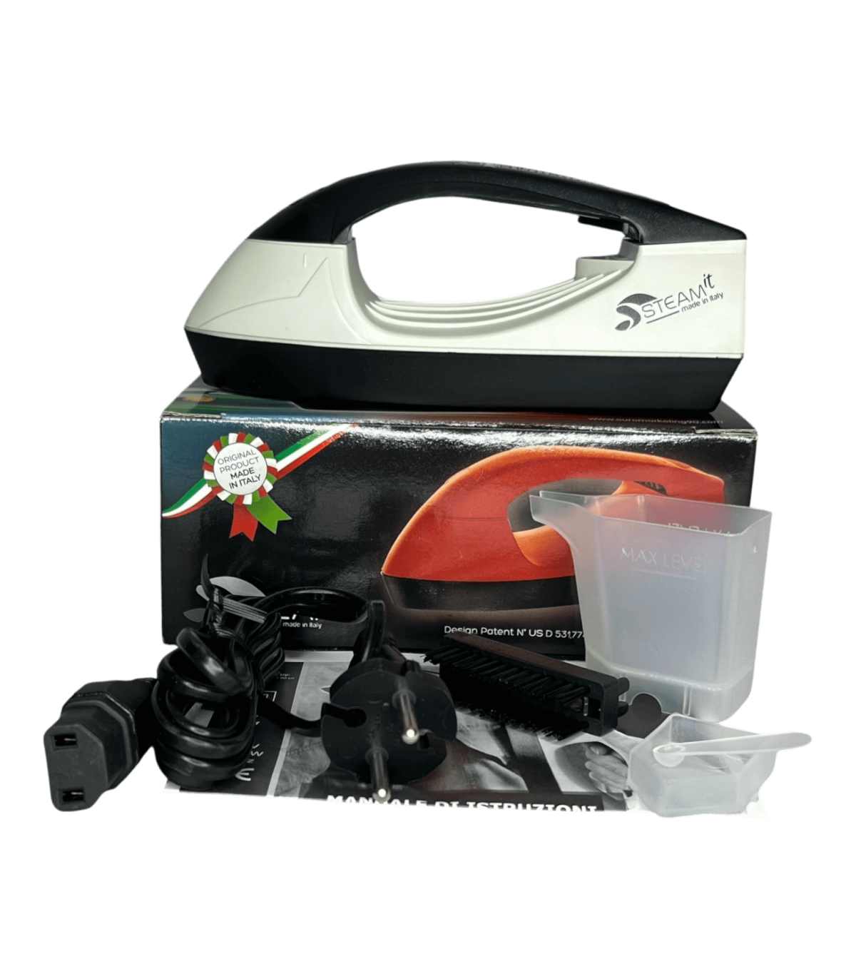 Mini fer à repasser et défroisseur Steam-it Grey-Noir, compact et léger (env. 500 g), utilisable sans réglage, compatible 110V et 220V, fourni avec gobelet doseur, récipient à sel intégré, cuillère doseuse ( 1 doses tous les 2 remplissages si noire, 2 à 3 doses si transparente), brosse en nylon, câble avec prise 220V française, notice incluse.