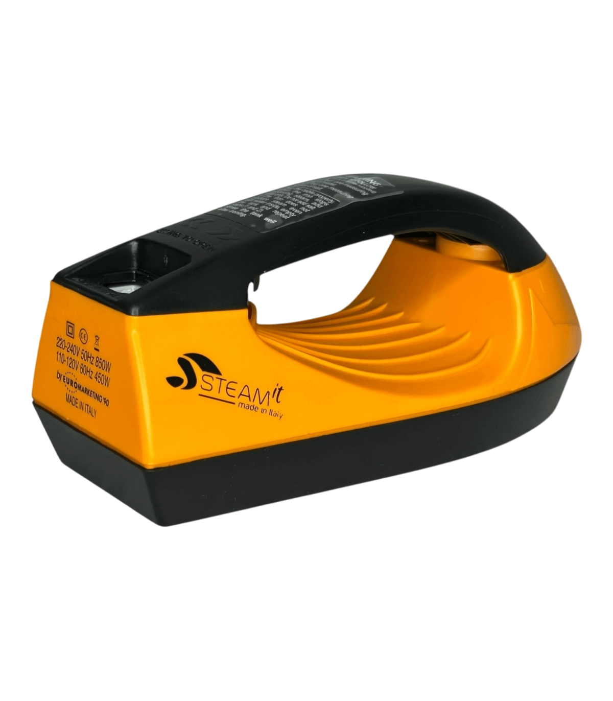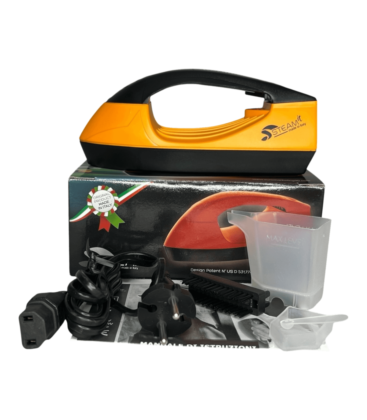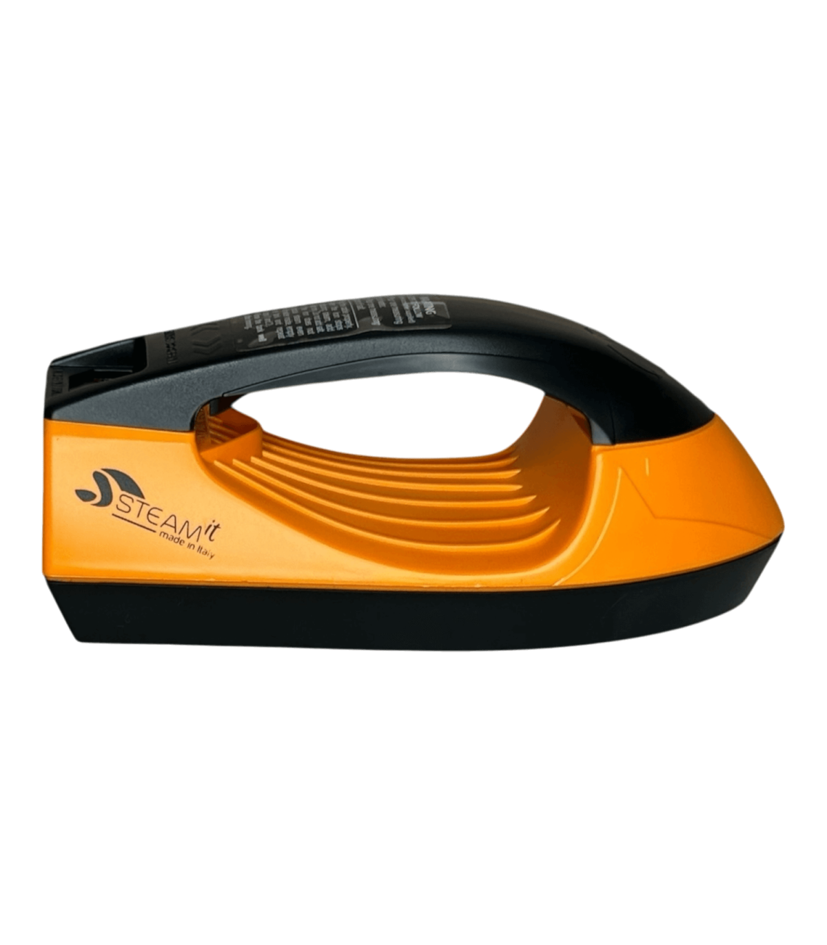 Mini fer à repasser et défroisseur Steam-it Orange-Noir, compact et léger (env. 500 g), utilisable sans réglage, compatible 110V et 220V, fourni avec gobelet doseur, récipient à sel intégré, cuillère doseuse ( 1 doses tous les 2 remplissages si noire, 2 à 3 doses si transparente), brosse en nylon, câble avec prise 220V française, notice incluse.