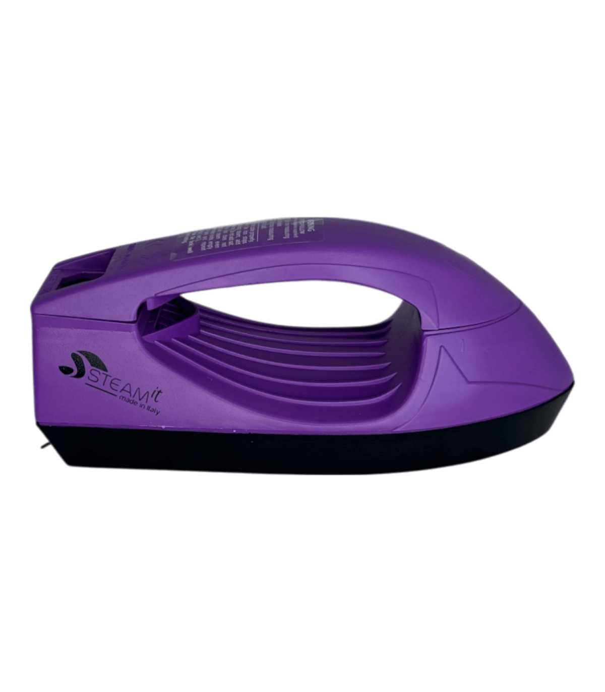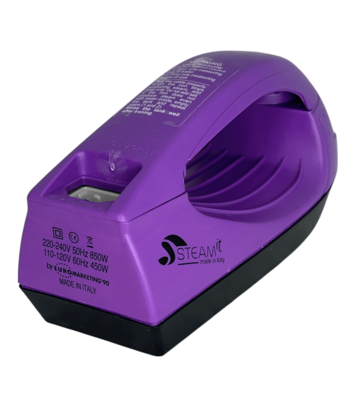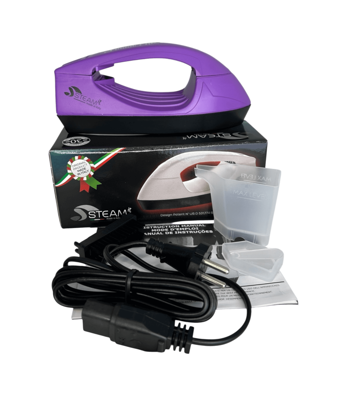 Mini fer à repasser et défroisseur Steam-it purpre, compact et léger (env. 500 g), utilisable sans réglage, compatible 110V et 220V, fourni avec gobelet doseur, récipient à sel intégré, cuillère doseuse ( 1 doses tous les 2 remplissages si noire, 2 à 3 doses si transparente), brosse en nylon, câble avec prise 220V française, notice incluse.