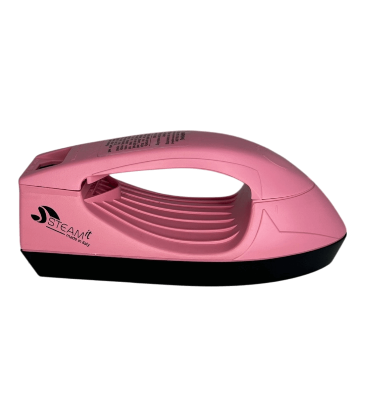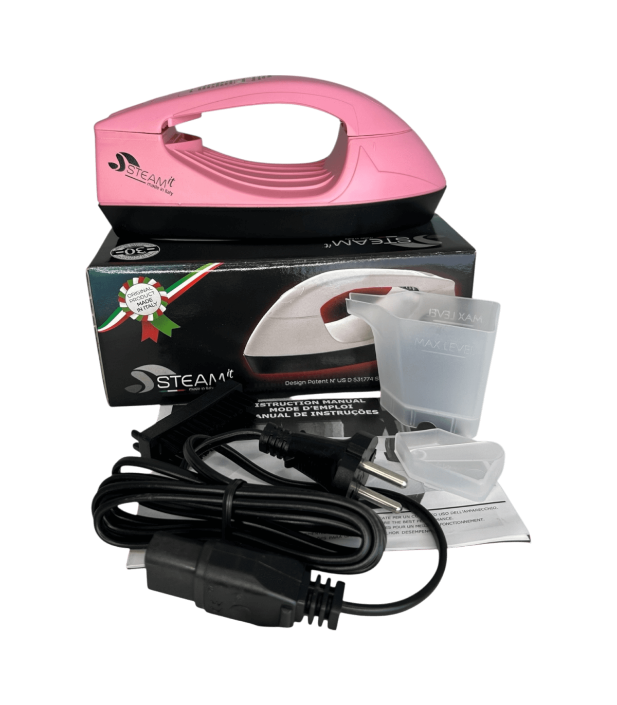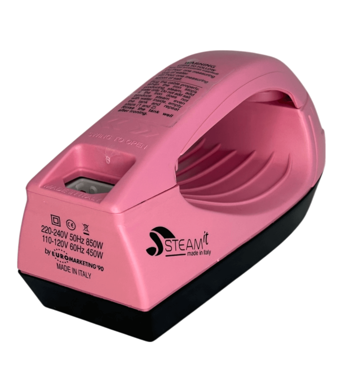 Mini fer à repasser et défroisseur Steam-it rose, compact et léger (env. 500 g), utilisable sans réglage, compatible 110V et 220V, fourni avec gobelet doseur, récipient à sel intégré, cuillère doseuse ( 1 doses tous les 2 remplissages si noire, 2 à 3 doses si transparente), brosse en nylon, câble avec prise 220V française, notice incluse.