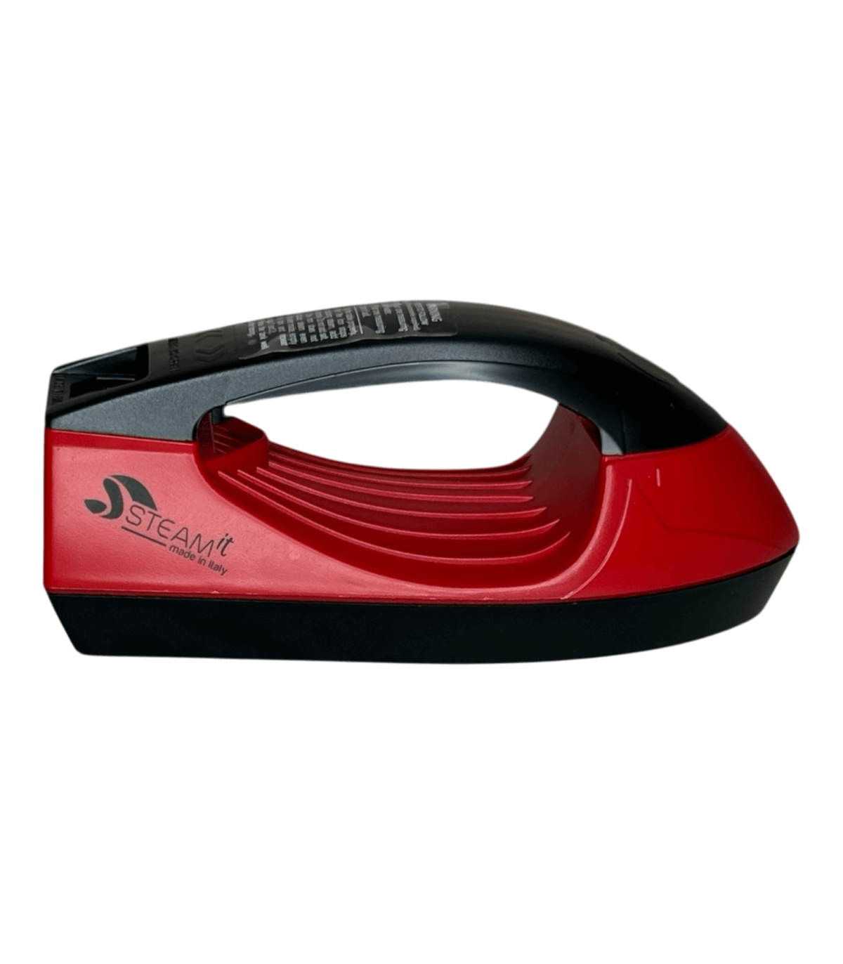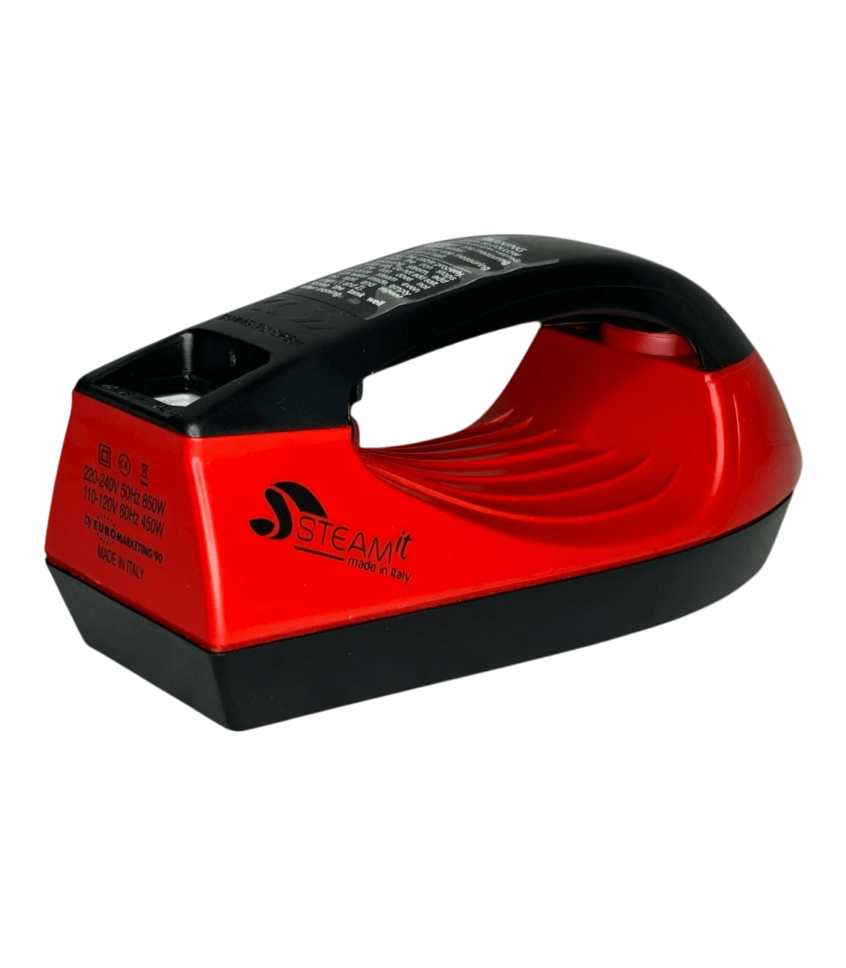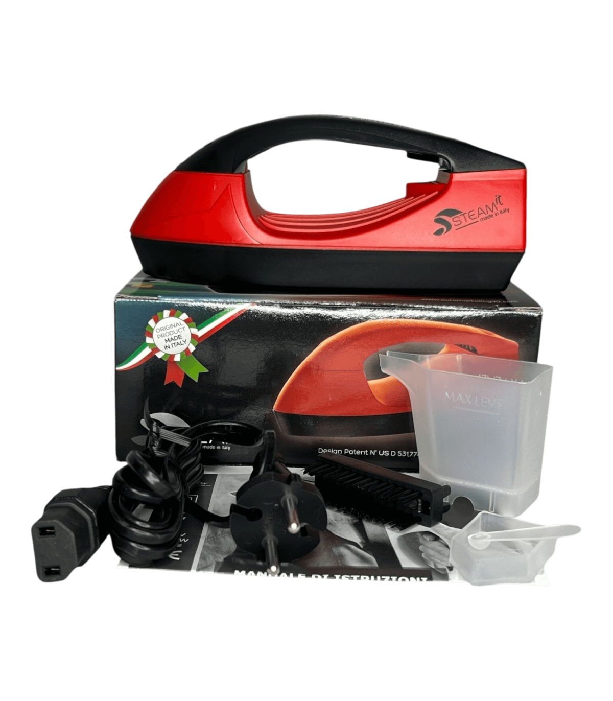 Mini fer à repasser et défroisseur Steam-it Rouge-Noir, compact et léger (env. 500 g), utilisable sans réglage, compatible 110V et 220V, fourni avec gobelet doseur, récipient à sel intégré, cuillère doseuse ( 1 doses tous les 2 remplissages si noire, 2 à 3 doses si transparente), brosse en nylon, câble avec prise 220V française, notice incluse.