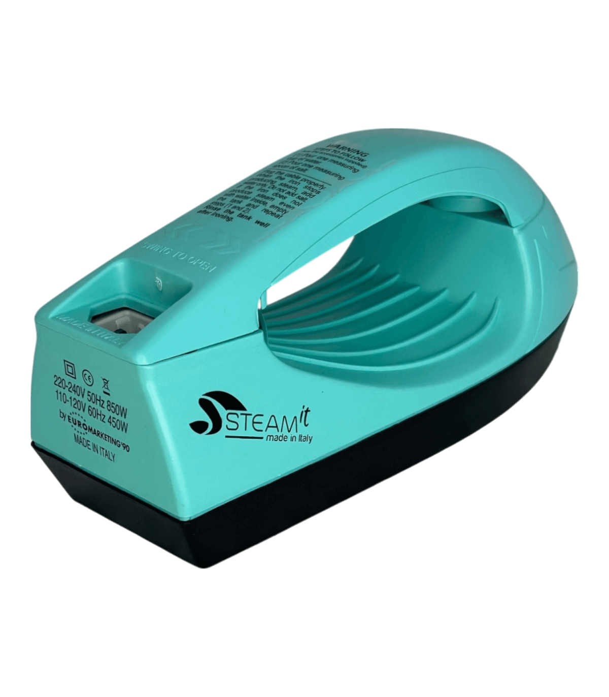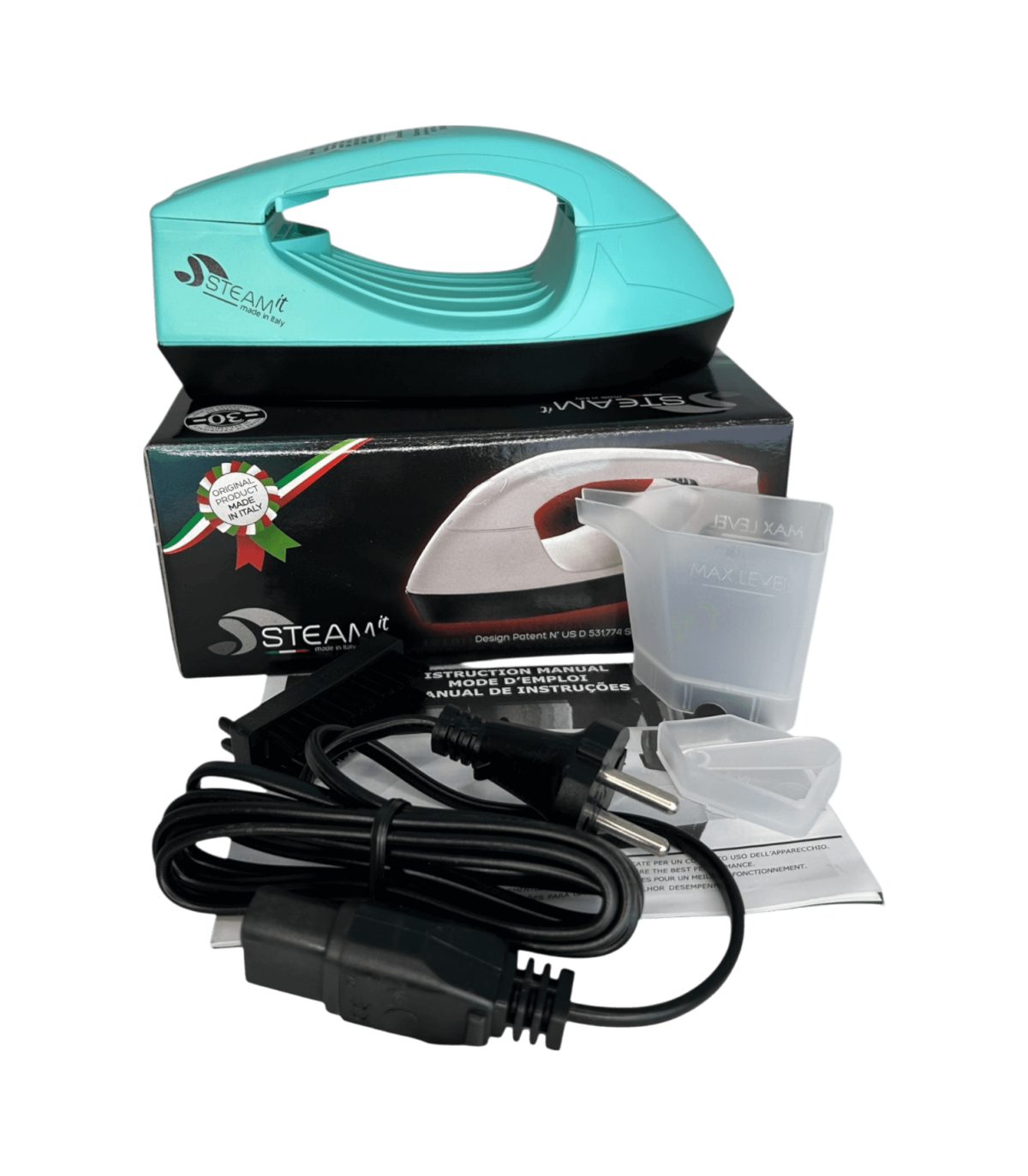 Mini fer à repasser et défroisseur Steam-it tiffany, compact et léger (env. 500 g), utilisable sans réglage, compatible 110V et 220V, fourni avec gobelet doseur, récipient à sel intégré, cuillère doseuse ( 1 doses tous les 2 remplissages si noire, 2 à 3 doses si transparente), brosse en nylon, câble avec prise 220V française, notice incluse.