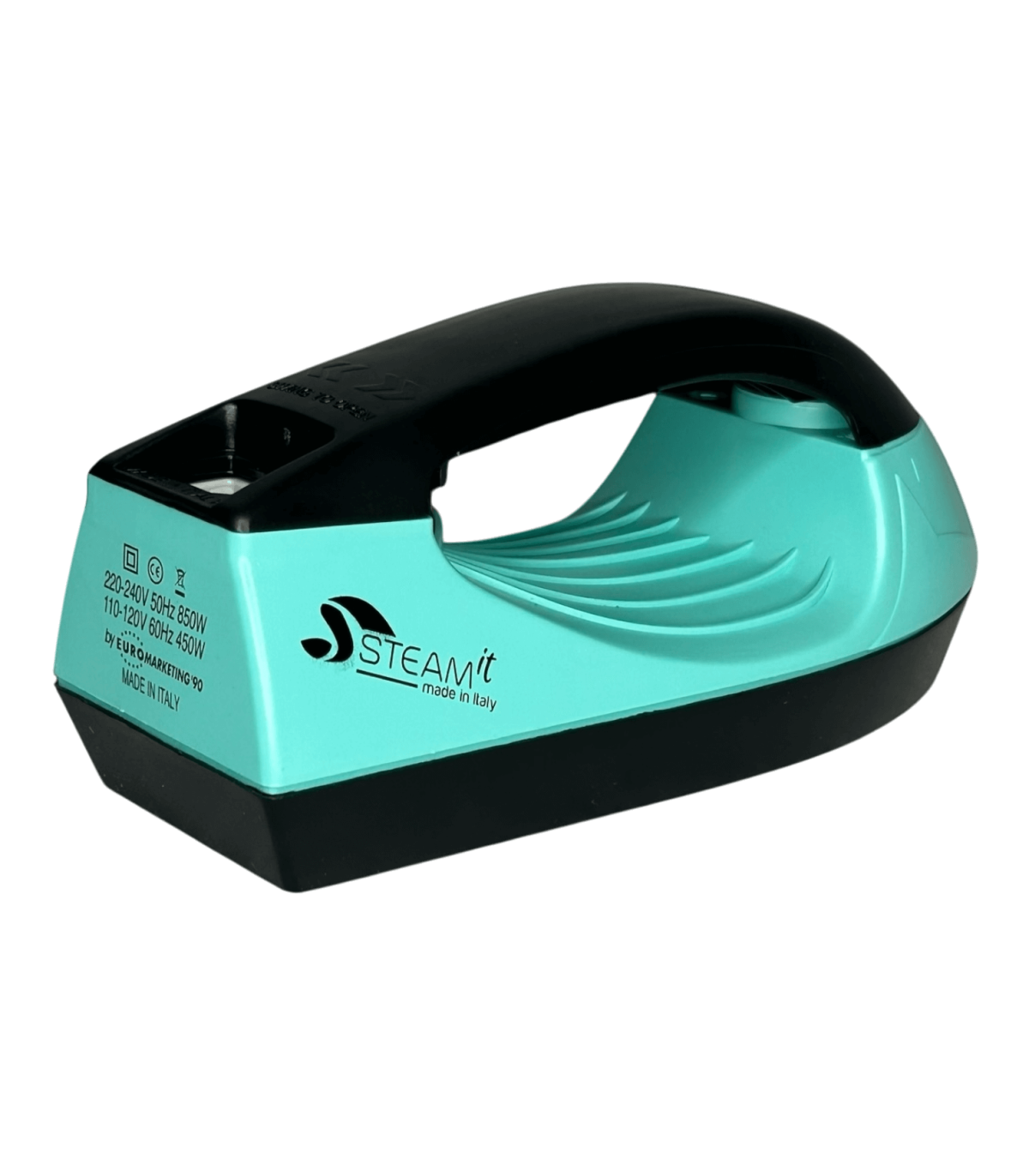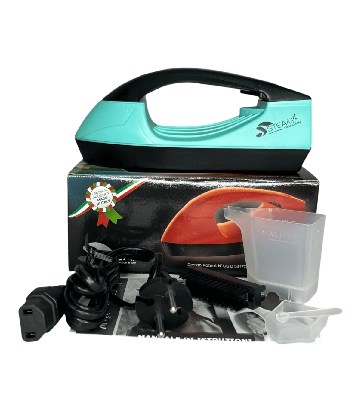 Mini fer à repasser et défroisseur Steam-it Tiffany-Noir, compact et léger (env. 500 g), utilisable sans réglage, compatible 110V et 220V, fourni avec gobelet doseur, récipient à sel intégré, cuillère doseuse ( 1 doses tous les 2 remplissages si noire, 2 à 3 doses si transparente), brosse en nylon, câble avec prise 220V française, notice incluse.